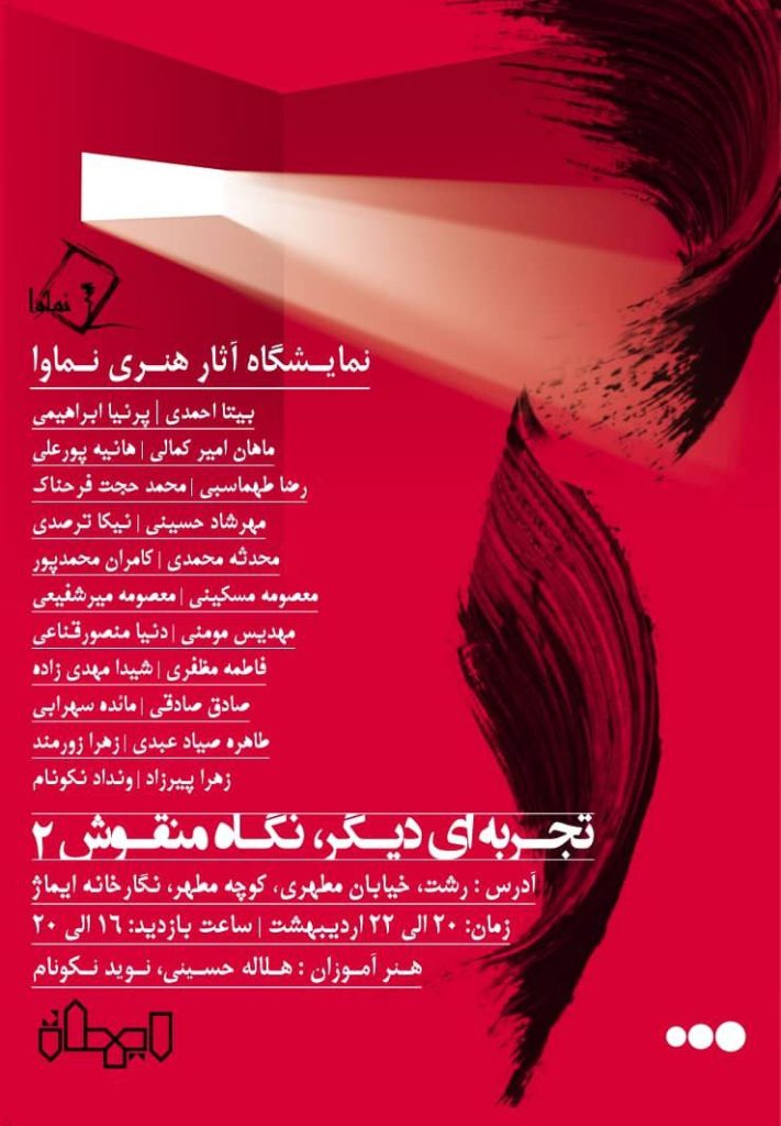 رویدادها نمایشگاه ها و اجراها همه طراحی و نقاشی تصویرسازی رویداد عکاسی نمایشگاه گروهی نقاشی با عنوان «منظره ی اکنون» در نگارخانه ایماژ نمایشگاه آثار هنری نماوا نمایشگاه گروهی تصویرسازی "مار و رازهای کهن" نمایشگاه گروهی طراحی و نقاشی "تجربه" کیتور علی راسخ سومین سالروز درگذشت مرحوم هوشنگ ابتهاج (سایه) نمایشگاه نقاشی های بهنام ولدوند و لیدا پولکی "سفر به فراسو" نمایشگاه انفرادی عالیم رزمجو "من به تصویر روایت" نمایشگاه نقاشی انفرادی سپیده حسنلو نمایشگاه عکس میان تور برگزاری نمایشگاه گروهی تصویر سازی با عنوان"سایه ی آب" در ایماژ برگزاری نمایشگاه نقاشی با عنوان «تنهایی» مهسا دوستدار در ایماژ برگزاری اولین سالانه نقاشی گروه «نقاشان معاصر ایران» در موسسه ایماژ برگزاری نمایشگاه نقاشی «یک نفس بیشتر» فرهود فیض ده در ایماژ برگزاری دومین نمایشگاه نقاشی انفرادی با عنوان «بازتاب خیال» در موسسه ایماژ برگزاری نمایشگاه گروهی آبرنگ با عنوان «رنگ سار» در موسسه ایماژ